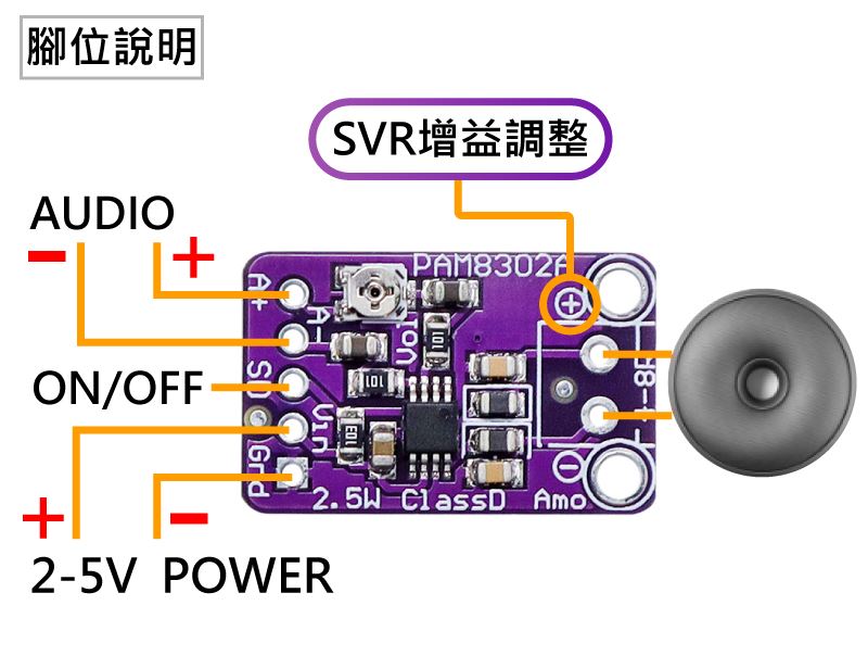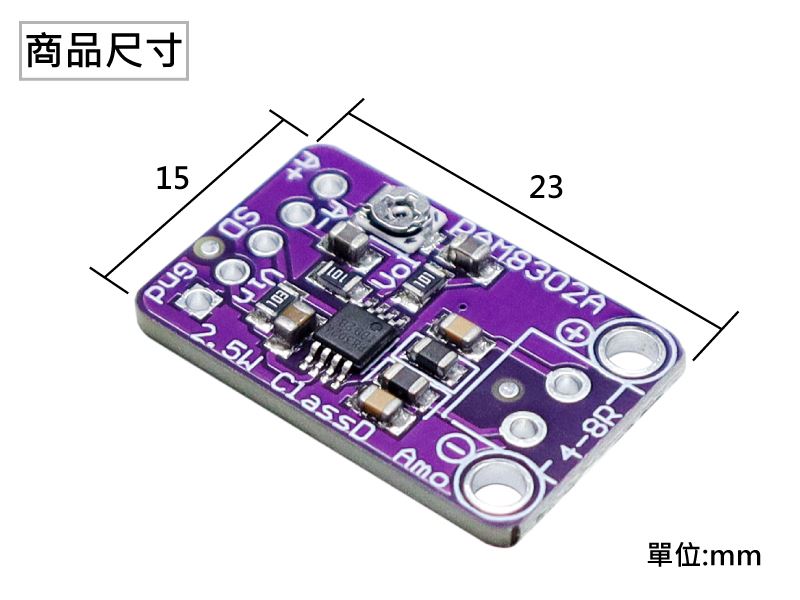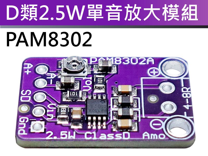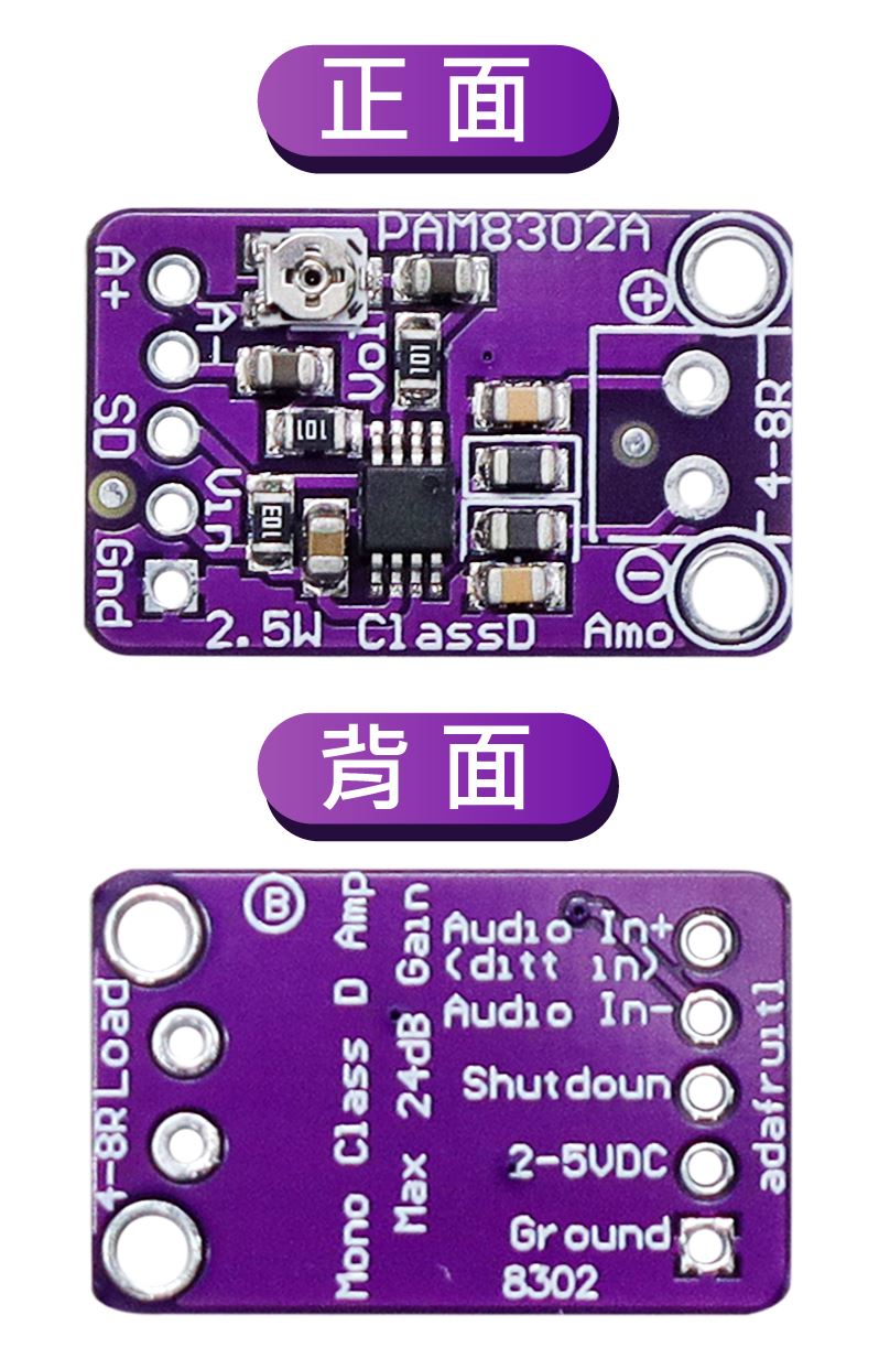 ●PAM8302模組是一個單聲道D類2.5W單聲道功率放大器。低的總諧波失真度+低雜訊(THD+N)效能使其在音訊放大時具有更高的保真度。可直接驅動揚聲器,效率高達88%。具有短路保護和熱保護功能,低的靜態功耗和低的EMI。