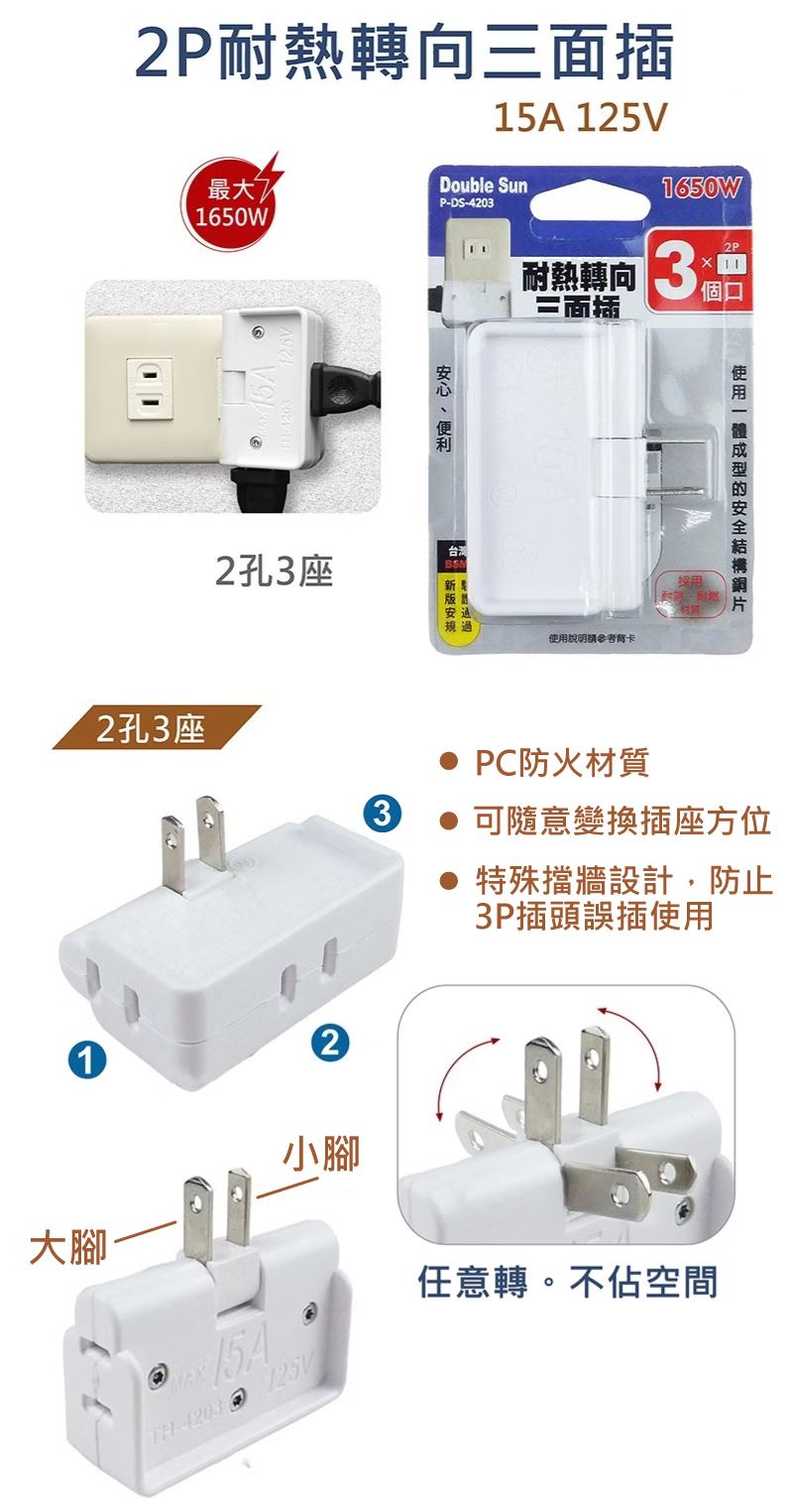 ●轉向插頭設計,可隨意變換插座方位,三面皆可使用
