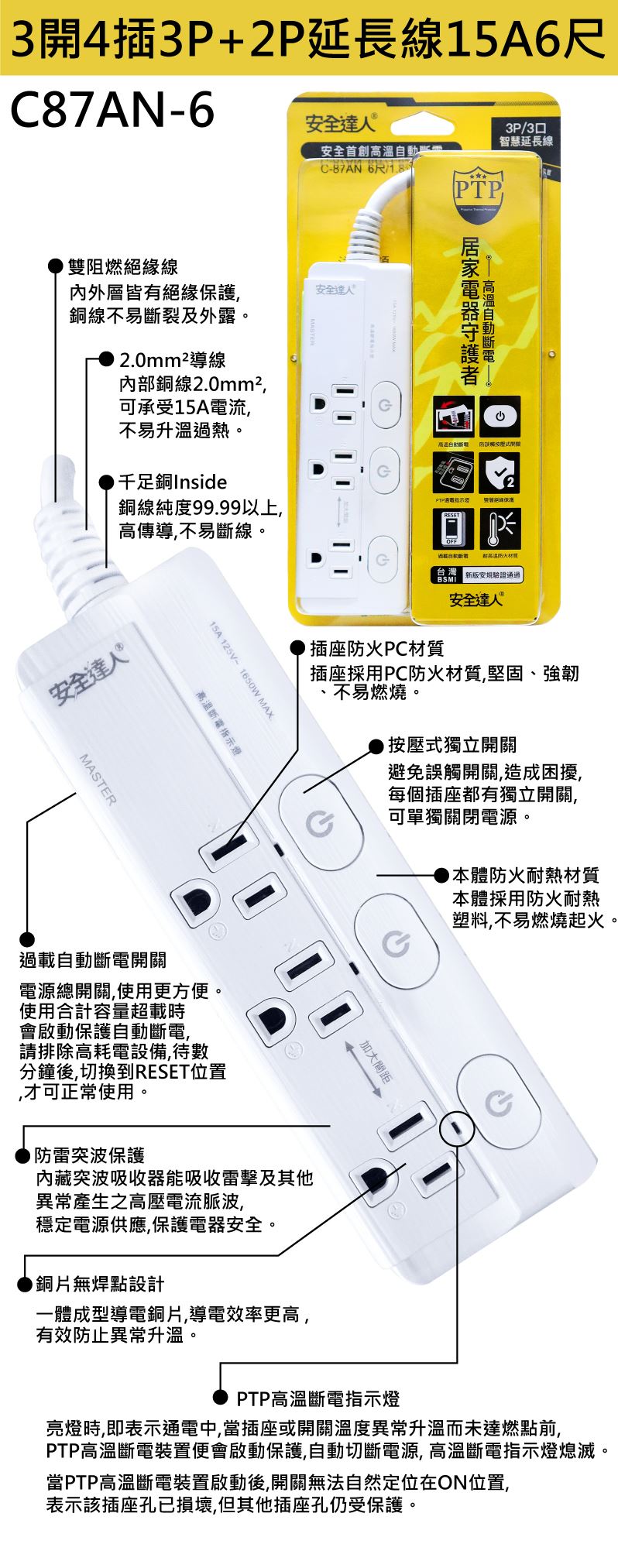 ●全球首創!高溫斷電防火裝置,開關內設置高溫斷電保護裝置,當開關或插座產生異常高溫而未達燃點時,PTP便會啟動,開關自動跳脫斷電,指示燈熄滅。