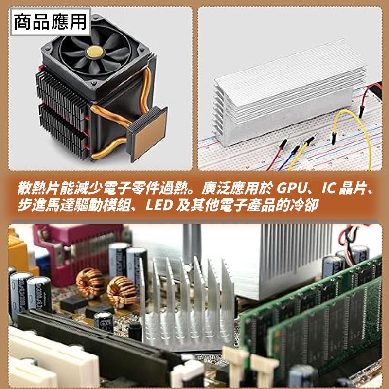 ● 散熱片主要應用在電腦微處理器(CPU)、圖形顯示卡(VGA)、單晶片和多晶片模組(GPU)等電子元件上,目前是電子散熱最普遍的產品之一,避免溫度升高導致性能下降或損壞