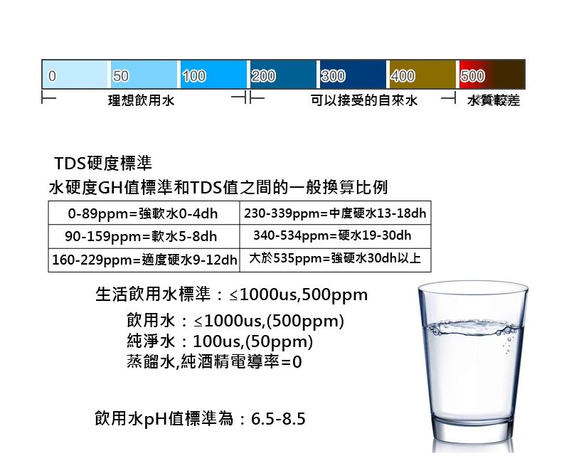 ●TDS (Total Dissolved Solids),中文名:總溶解固體,又稱溶解性固體總量,表明1升水中溶有多少毫克溶解性固體。一般來說,TDS值越高,表示水中含有的溶解物越多,水就越不潔淨。因此,TDS值的大小,可作為反映水的潔淨程度的依據之一。