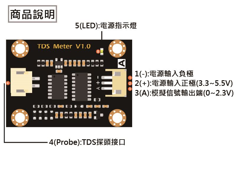●一款與Arduino相容的TDS感測器,用於測量水的TDS值,TDS數值可反應水的潔淨程度,可應用於生活用水、水培等領域的水質檢測。