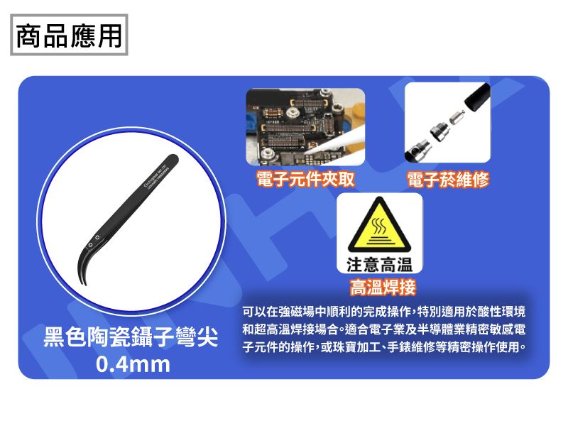 ●可以在強磁場中順利的完成操作,特別適用於酸性環境和超高溫焊接場合。適合電子業及半導體業精密敏感電子元件的操作,或珠寶加工、手錶維修等精密操作使用。